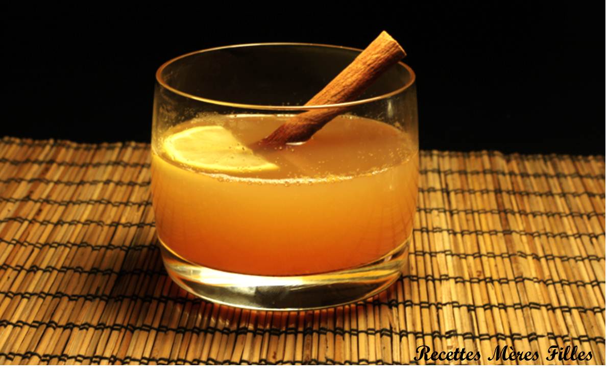 Mettez 2 cl de rhum au fond de chaque verre. Passez le mélange à la passoire avant de verser dans les verres. Coupez la rondelle de citron en 2. Et ajoutez les bâtons de cannelle pour la déco !