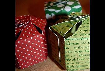 Dans le même ordre d'idée que la boîte présentée la semaine passée (gabarit Posca), voici une très jolie petite boîte que l'on peut réaliser grâce à un gabarit de découpe Fiskars, que l'on utilise avec le Shape Cutter (pour celles qui se demande ce que c'est, par ici).La forme est quasiment la même que pour la boîte précédemment évoquée, mais elle est beaucoup plus petite et surtout l'utilisation du gabarit rend sa réalisation beaucoup plus rapide et facile (idéal si comme moi vous devez en fabriquer plusieurs).Voici ma petite démo :Pour illustrer, voici celles que j'ai réalisé pour l'instant, soit avec du papier à motifs, soit en tamponnant sur du papier cartonné uni des motifs que j'ai embossé avec des paillettes. Amusez vous bien les filles !!