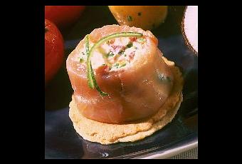 -> Etalez 4 tranches de Saumon de Norvège fumé sur du film alimentaire, en un grand et long rectangle et égalisez-le. Récupérez les chutes de saumon et hachez-les avant de les mettre dans le mélange aux légumes avec un peu de coriandre ciselée.