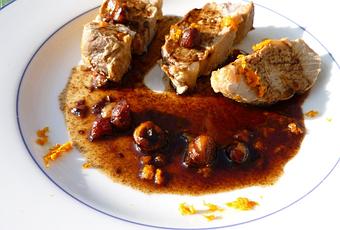 Une fois le filet cuit, le laisser reposer au chaud une dizaine de minutes et terminer la sauce : déglacer le plat de cuisson avec le jus de l’orange, ajouter aux noisettes, saler et poivrer. Faire bouillir quelques minutes pour réduire la sauce.