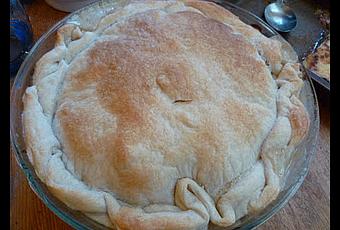 - verser le mélange au poulet dans un plat à gratin rond si votre pâte feuilletée est ronde (ou rectangulaire si elle est de la même forme)
