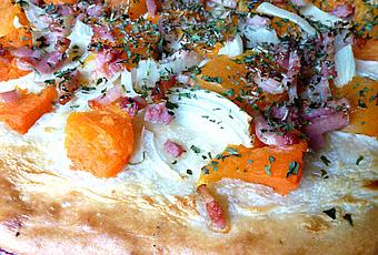 Préchauffer le four à 240°C. Sur la grille du four préalablement recouverte d'une feuille de cuisson, étaler la pâte à pizza. Napper dessus la crème. Puis parsemer les dés de potiron, l'oignon émincé et les lardons.