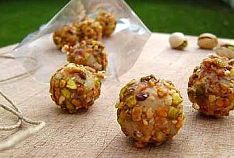 3. Rouler les boules dans le mélange pralin pistache et les faire rouler dans la paume de la main en exerçant une légère pression.