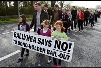 Et dimanche dernier, le village de Ballyhea, dans le nord du comté de Cork, après la deuxième messe, a connu sa trente-huitième marche hebdomadaire. Un aller-retour de vingt minutes du parking de St-Mary jusqu’à au panneau à la sortie de la bourgade. Au fil des mois, la marche s’est quand même dotée d’un calicot : "Ballyhea dit non ! Au renflouement des obligations." Une discrète bouffée de tempérament dans un pays terrorisé, timide.