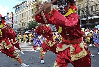 Lors de la parade d’ouverture du festival Thung Si Muang, la communauté Sino-Thaïe d’Udonthani effectuait également sa parade. Toujours haute en couleur elle se déroule dans un bruit assourdissant de tambours, de cymbales et de pétards.