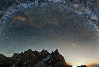 La Voie Lactée enjambe quelques sommets montagneux du massif des Dolomites, dans les pré-Alpes italiennes (nord de l’Italie). Edoardo Brotto, l’auteur de ce superbe paysage réunissant la terre et le ciel, l’a très joliment nommé « la couronne des Dolomites ».