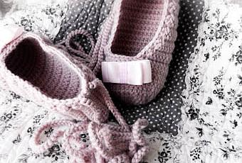 J’ai revu et corrigé les Ballerina Lace, j’ai changé le noeud et l’ai remplacé par un satin rose agrémenté d’un joli vichy pâle; et j’ai rajouté des liens pour attacher les ballerines à la jambe sur trois tours.