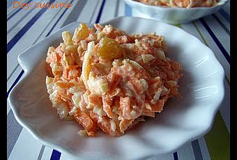 Pour 4 à 6 personnes : 3 carottes, 1/4 choux blanc, 4 cs de raisins blonds, 3 cs de yaourt nature, 3 cs de mayonnaise, 1 cc de moutarde à l'ancienne, 1 cs de vinaigre de cidre, sel et poivre- Peler et râper les carottes. Émincer le choux (si vous le faites au robot, choisir la grosse lame sinon vous allez avoir de la purée...).