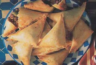 - Sur un plan de travail fariné, étalez la pâte et coupez-la en 12 carrés de 12 cm de côté environ. Répartissez-y la farce. Mouillez les bords des carrés et repliez-les en triangle. Avec un pinceau de cuisine, badigeonnez-les de jaune d’œuf battu et posez-les sur la plaque du four couverte de papier sulfurisé.