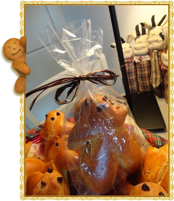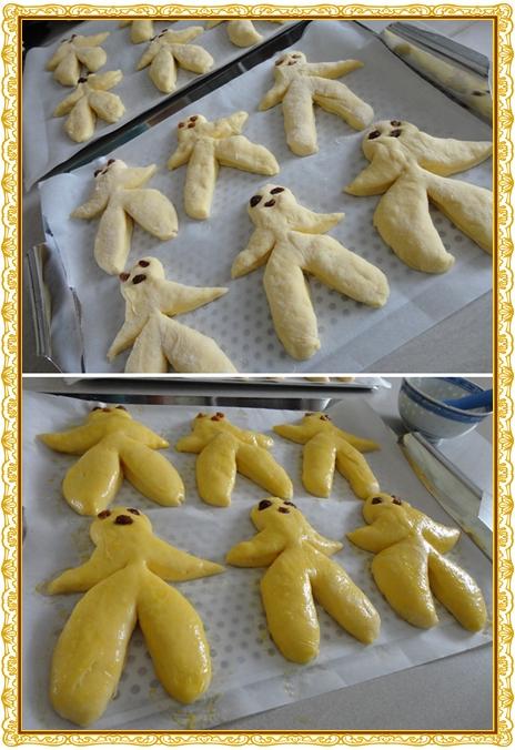 5 - Piquer des morceaux de raisins secs pour former les yeux et la bouche des bonshommes. Laisser lever à nouveau 1h30.