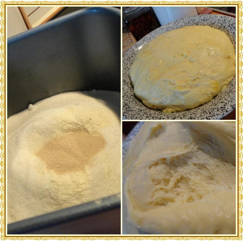 Mettre dans le fond de la cuve, tous les ingrédients liquides (beurre, lait, jaunes d'oeufs et sel) et sur le dessus terminer par les ingrédients solides (sucre, sucre vanillé, farine, levure). Lancer le programme pâte (1h10).