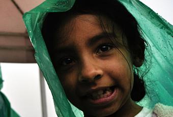 Melaní, petite crevette de sept piges, emballée dans un poncho en plastique, tape la discute à la fin du projet, pendant que tout le monde remballe.