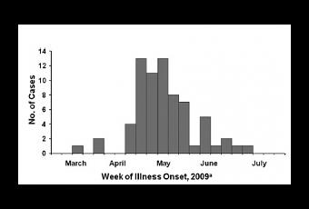 Source: Clinical Infectious Diseases « A Novel Vehicle for Transmission of Escherichia coli O157:H7 to Humans: Multistate Outbreak of E. coli O157:H7 Infections Associated With Consumption of Ready-to-Bake Commercial Prepackaged Cookie Dough—United States, 2009” (Schéma pour les US “Outbreak-associated Escherichia coli O157 cases by week of illness onset, United States, 1 March–31 July 2009”)