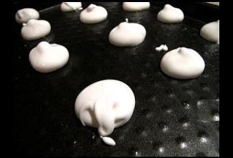 Enfourner durant 1h 30 dans un four à 110°C (Th 3).Laisser refroidir les meringues sur une grille, et ranger les dans une boite pour pouvoir les conserver.
