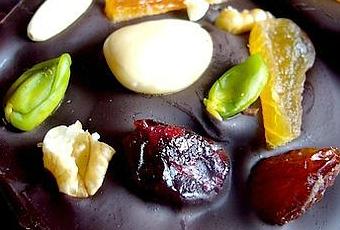 3. Posez sur les ronds de chocolat les fruits secs. Faites prendre le chocolat au frais. (Dans ma chambre pour moi car en ce moment, c'est un vrai frigo).