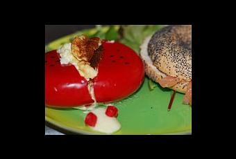 Attendre que le soufflé tiédisse puis le disposer dans la coque du Babybel (trop chaud, il la ferait fondre, j’ai testé pour vous).