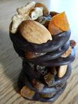 - A l'aide d'une petite cuillère, déposez cinq petits tas sur des pochettes cristal (pour les documents papier, oui, c'est bien ça), tapotez légèrement pour que le chocolat s'étale un peu. Décorez avec les fruits secs. Recommencez par fournées de cinq pour qu'elles ne durcissent pas trop vite. Laissez durcir à température ambiante.