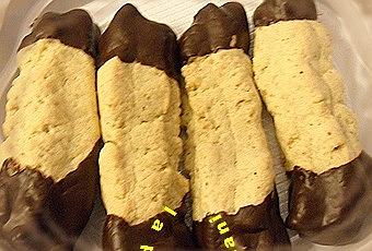 Faire fondre le chocolat au bain marie, ajouter un peu d'huile environ 1 cc, et dés que les biscuits ont refroidis, tremper les extrémités et laisser sécher sur une grille (j'ai laissé toute une nuit).
