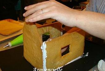 Je reprends ma poche à douille et je passe au collage du toit. J’enduis donc les pans de murs de façons à ce que le toit adhère.