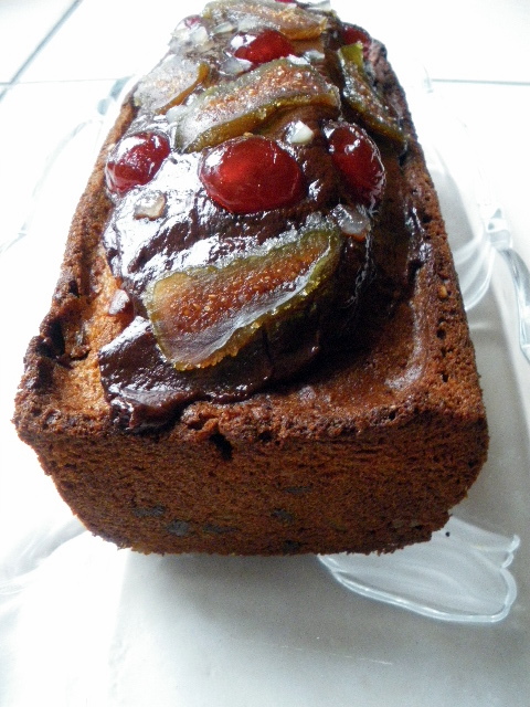 Après refroidissement recouvrir le cake d'une ganache et décorer de fruits confits.