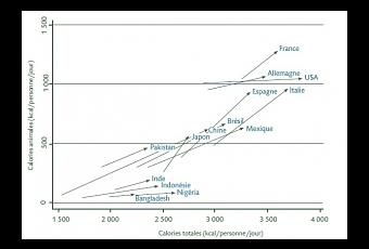 Nous sommes l'un des pays qui « offre » le plus de calories à chacun de ses habitant, soit, en moyenne, près de 3.500 par jour (Voir schéma ci-contre). Plus nous consommons, plus l'obésité nous menace et plus nous dégageons un « impact carbone ». Nous aurions donc visiblement intérêt à réduire notre alimentation et à consommer « mieux » -ce qui n'a quasiment pas d'impact en matière d'environnement. C'est l'un des axes de cette étude DuALIne qui a, plus globalement, mené réflexion sur l'alimentation de notre planète dans ses perspectives démographiques, économiques, environnementales et macrosociales. Des conclusions publiées par l'INRA au 12 décembre.