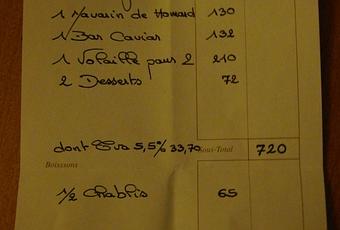 Curieux et gourmands (comme d’habitude), nous envisageons initialement de nous faire une intégrale entrée, poisson, viande (éventuellement fromages) et dessert. Le directeur de salle, avisé, raisonnable et plein de finesse, nous suggère diplomatiquement que cela risque d’être trop. Il nous apprend l’existence de « demi-portions » et de propositions du jour. Nous partons, sur ses conseils, sur le chaud-froid d’œufs mollet au cresson, asperges et caviar gold (132€ en version intégrale, 78€/personne en version dégustation). O enchainera sur les escalopines de bar à l’émincé d’artichaut, nage réduite au caviar (132€), navarin de homard et pommes de terres nouvelles au romarin (130€) pour moi. Nous partageons ensuite la Poulette de Bresse rôtie au beurre de marjolaine, timbale de macaroni aux morilles (210€ pour deux). Enfin, tarte fine sablée au chocolat, glace à la vanille Bourbon (30€) pour O. Assortiment de desserts (40€) : un peu de tarte au chocolat, bien sur, de la meringue moelleuse aux fraises des bois, crème chantilly, et de la dacquoise au praliné, giboulée de fraises du jardin. Étant le seul à boire, je choisis une demi bouteille de Chablis (65€, tout de même!).