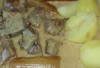 Filtrez la sauce et remettez-là dans la cocotte avec la viande et les poireaux. Ajoutez le mélange moutardé et faites épaissir la sauce sur feu doux en remuant doucement.
