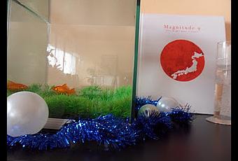 Au début il ne bougeait pas trop, mais après une journée, il commence à se sentir mieux et il bouge un peu plus dans son aquarium, à côté de l'Artbook de Magnitude 9. D'ailleurs il croit qu'il n'est pas seul, il se voit dans les parois de l'aquarium qui le reflètent.... et il donne des coups de tête pour se défendre :DMais ce week-end, en plus de faire l'acquisition de ce maaaagnifique poisson rouge, nous avons aussi été acheter un sapin de Noël !