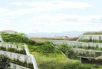 L’agence OFF architecture a récemment dévoilé un projet de logements verts à Anglet en collaboration avec Duncan Lewis SCAPE architecture. Les logements proposés ont l’originalité d’être recouverts d’une couche de végétation luxuriante. Le projet est structuré autour de deux axes qui organisent les fonctions des différents bâtiments. En fonction des points d’accès du complexe dans son contexte environnant, le projet multiplie les entremêlements entre les corps de bâtiment, les passages, les tunnels, et les espaces verts. Au centre du complexe trône le grand jardin central, qui distribue les différents espaces. Le complexe compte au total 98 résidences, dont 70 appartements avec balcon, pour une longueur de 12 mètres. L’intérêt de ce projet réside principalement dans le rôle accordé à la faune et à la flore qui, en quelque sorte, sont ici utilisés comme véritables matériaux de construction, cachant par la même occasion les éléments de maçonnerie comme le béton. Une approche qui rappelle également certains des projets de l’agence d’architecture SITE, dont je vous reparlerai peut-être.