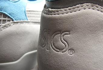 Cette fois, les sneakers possèdent un dessus en daim gris contrasté par du bleu ciel.
