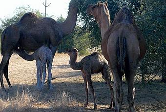 La route entre Jaisalmer et Jodhpur s'avère sans surprise maintenant que la route est large et bien goudronnée. Les troupeaux de chèvres traversent bien sûr toujours au moment où nous arrivons, mais nous commençons à avoir l'habitude (et le chauffeur surtout !) de voir du bétail partout et faire ce qui lui plait. Un petit troupeau de dromadaires sont en train de "brouter" avec leurs petits chamelons qui ne doivent pas avoir plus de deux-trois jours, le petit blanc arrive tout juste à se mettre sur ses pattes pour têter sa mère. Nous voyant arrêtés sur le bord de la route, un car de touristes français stoppe également et là bien sûr, discrétion oblige, le troupeau s'empressa de partir un peu plus loin fuyant la célébrité future.