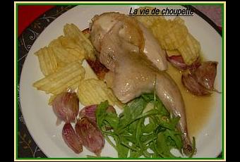 Garnissez la cavité des croûtons avec la farce, posez sur chacun d'eux deux demi-perdreaux. Servez avec les gousses d'ails et le jus autour. Garnissez d'un bouquet de cresson et servez à part des pommes gaufrettes.