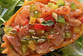 Intéressant ici dans la composition du ceviche, pour la fraîcheur de sa pulpe, le croquant (très croquant) de ses graines et puis pour le visuel (il est plutôt original et coloré).