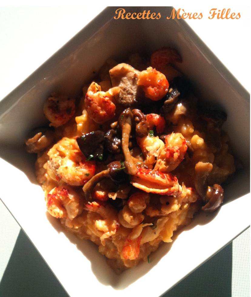Au bout de 30 minutes faites revenir dans 1 poêle, 1 cuillère à soupe d'huile et faites y dorer les champignons pendant 5 minutes puis ajoutez les queues d'écrevisses et laissez cuire 2 minutes de plus, salez et poivrez. Réservez au chaud.