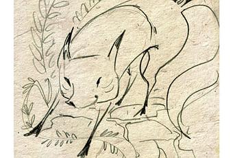 L'homme a la peau sombre. Son visage semble épouser les ombres de la pièce. Difficile de déterminer sa carrure sous ce large manteau végétal. Il a des longues mains terreuses et les ongles si épais qu'ils paraissent griffus, comme les pattes d'une taupe. Ses cheveux crépus tout emmêlés sont retenus dans une corde d'où s'échappent des tiges tournicotées, vrillées, comme les sarments d'une vigne. Il prépare du poisson grillé. Le fumet met l'eau à la bouche.