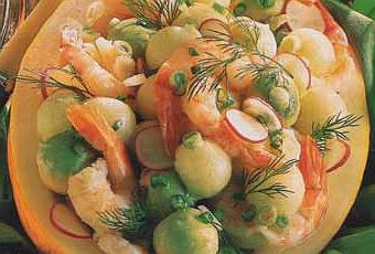 Pour 6 personnes : 1 melon vert de 1,5 kg environ, 2 avocats, 250 g de queues de gambas cuites, 1 douzaine de radis, le jus d’un demi-citron, 2 oignons frais, 3 brins d’aneth.