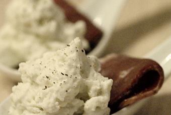 Secouer le siphon et dresser un dôme de chantilly de roquefort dans des cuillères. Ajouter une tranche de magret fumé et déguster.