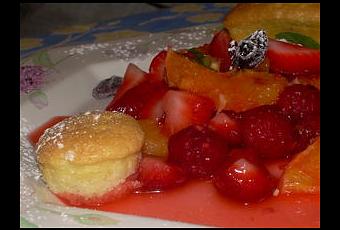 Je fais honneur aux fruits rouges dans cette salade de fruits. Pour faire une belle présentation, j'ai décoré mon dessert de quelques violettes en sucre au moment de servir.