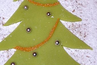 Pour le décor rien de plus simple, parsemer de sucre glace pour faire un effet neige, découper un sapin (faire au préalable un gabarit dans du papier pour qu'il soit à peu près symétrique) dans de la pâte d'amande verte, peindre le pied du dit-sapin avec du olorant marron (ou du chocolat fondu) et décorer vec des bonbons.