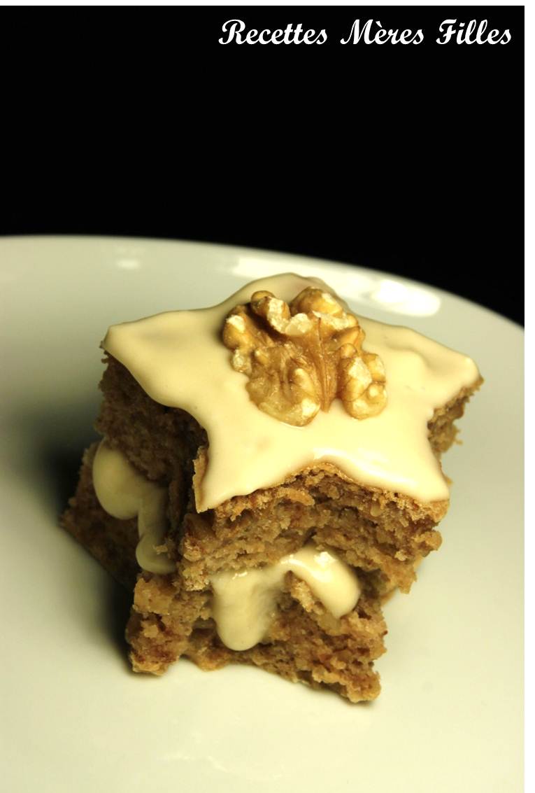 Coupez le gâteau en deux rectangles et tartinez une couche de crème au milieu et par dessus. J'ai ici utilisé mon emporte-pièce étoile pour faire plus Noël mais du coup on fait moins de part.Décorez avec des noix ou du chocolat en poudre. C'est un régal !