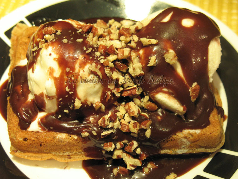 Suggestion du service : ajouter de la crème glacée à la vanille sur les gaufres et verser le chocolat chaud sur le dessus. Saupoudrer des pacanes hachées