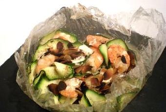 Répartir les courgettes, les crevettes, le fromage émietté et les amandes effilées au centre d'un carré de film transparent pour papillotes.
