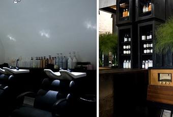Mélange de matières brutes, pierres apparentes et lumineuses contrastant avec le noir dominant de meubles rétro aux lignes modernes, cet ancien showroom sur deux étages et situé à deux pas de la Place des Vosges est devenu depuis plus d’un an un salon de coiffure. Ambiance cosy, banquette des années 60 en cuir noir, tout le mobilier que l’on trouve ici a été chiné dans les brocantes. Alexis, propriétaires des lieux voulait donner à cet espace l’esprit d’un concert de rock. Un rez de chaussé comparable à une scène où les bacs de lavage sont posés sur un parquet teint en noir. Au sous-sol se trouve l’espace VIP où les célébrités peuvent venir se faire coiffer en toute tranquillité, à l’abri des regards indiscrets. Sur le comptoir, un bouquet végétal réalisé par un fleuriste du quartier qui, depuis quinze ans, réalise chaque semaine une composition florale selon la saison. Atelier 7 ou l’art de jouer avec les contrastes…
