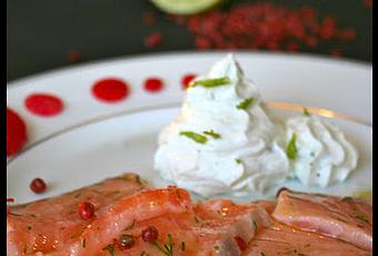 - au moment de servir, répartissez le saumon dans 4 assiettes, ajoutez la chantilly avec la poche à douille et parsemez de baies roses (1cc)