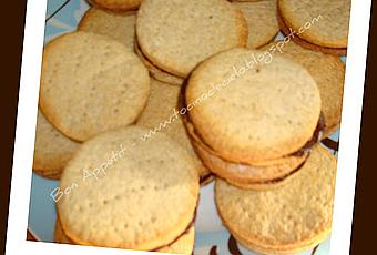 Preparar la ganache : hervir la nata. Fuera del fuego añadir el chocolate cortado en trozos. Dejar reposar y mezclar para obtener una crema lisa. Cubrir y pegar las galletas dos por dos.
