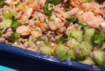 Suite à cela, il en restait encore. Pour le renouveler et être sûre qu'il se conserve, je l'ai fait cuire, ce qui donne des sortes de miettes de saumon. Il a ainsi agrémenté un bento plein de parfums et de textures : sarrasin, concombre, mangue, crevette, saumon, coriandre. Miam !