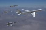 Oeuvre d’artiste présenté par l’américain Northrop Grumman, allié à EADS, montrant une opération de ravitaillement effectuée par le KC-30, version modifiée de l’Airbus A330. Boeing, lui, proposait une version dérivée de l’avion-cargo B767-200, le KC-767.