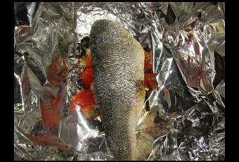 Faites cuire 10 minutes à 180°C, four préchauffé. La peau se décolle très facilement lorsque le poisson est cuit.