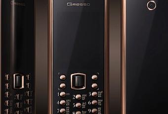 Voici un nouveau modèle nommé Grand Premiere tiré de la gamme Avantgarde de Gresso. Disposant d’une coque en or 18 carats, de verre de saphir et de touches gravées au laser, ce téléphone d’un autre temps tourne sous Symbian, pèse 190 grammes, abrite un hardware limité et est proposé pour 50 000$.