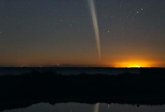 Telle une fine plume blanche plantée sur l’horizon doré, la comète montre un double panache très allongé dans le ciel austral, une double queue : l’une de poussières et l’autre de gaz ionisée par le vent solaire.